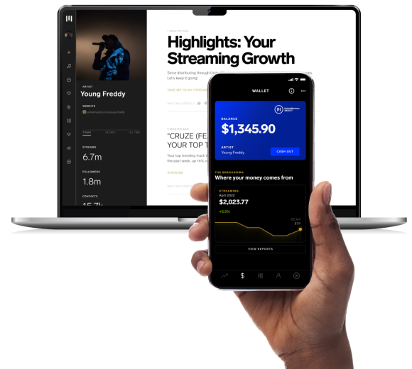 Aproveite todas as ferramentas que você precisa em qualquer dispositivo. Faça seu cadastro para lançar músicas, participar de ofertas de sincronização e parcerias de marcas de Exclusivos, gerenciar pagamentos e muito mais.